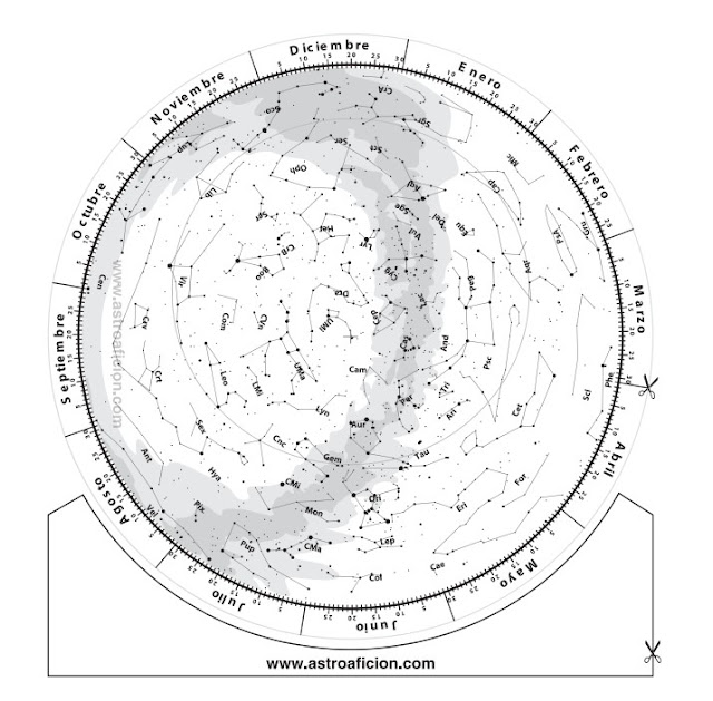 4. Con una carta celeste tradicional, sal a la calle, terraza, balcón, parque, campo, donde puedas y sea seguro, y empieza a identificar los puntos cardinales, el ecuador, el meridiano, las constelaciones, la luna, planetas y estrellas, después hazlo con una aplicación para el computador o el celular. Hay muy buenas y gratuitas. Puedes descargar uno modelo para armar tu planisferio desde